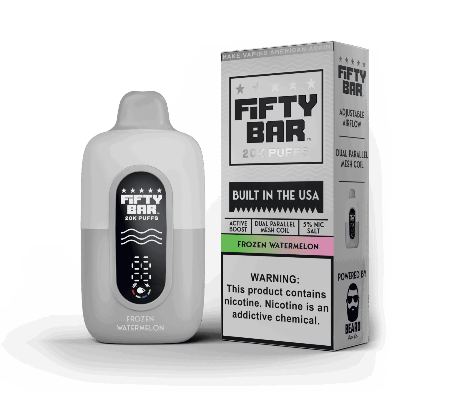 The Fifty Bar White Series stands alone as the premier USA-made disposable vape. Each device is assembled in California and filled with premium American-made e-liquid formulated by the legendary Beard Vape Co. This ensures a level of flavor purity and safety that imported disposables simply can’t match.