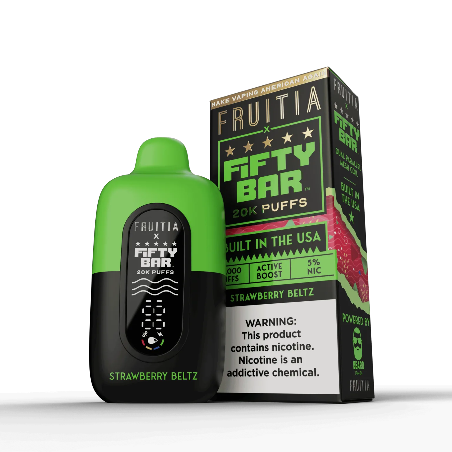The Fifty Bar x Fruita series takes flavor seriously. Built with American-made e-liquid and advanced mesh coil technology, this device ensures that the Strawberry Beltz flavor remains crisp and consistent from the first hit to the very last.